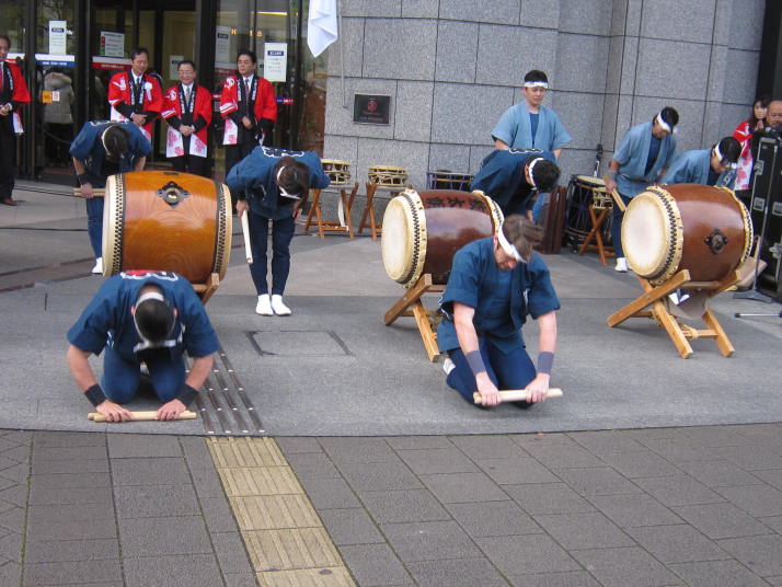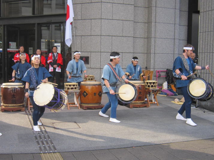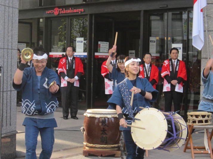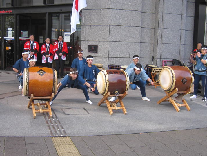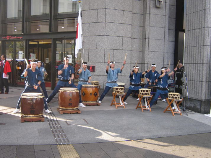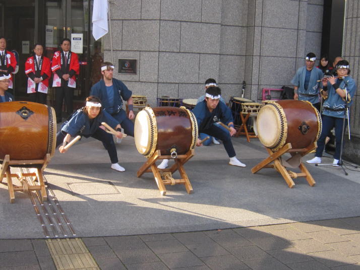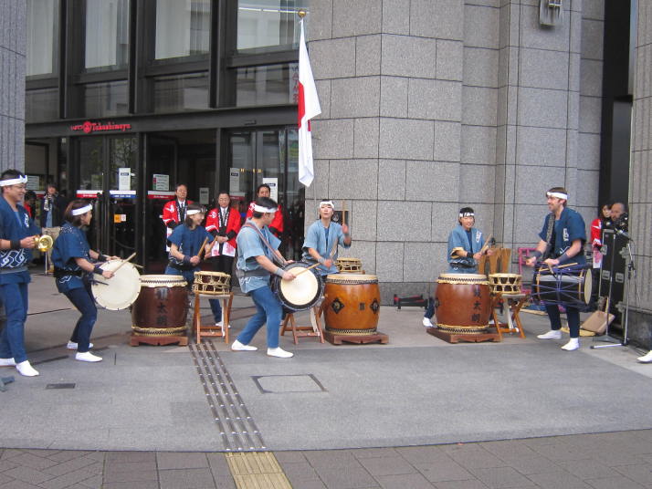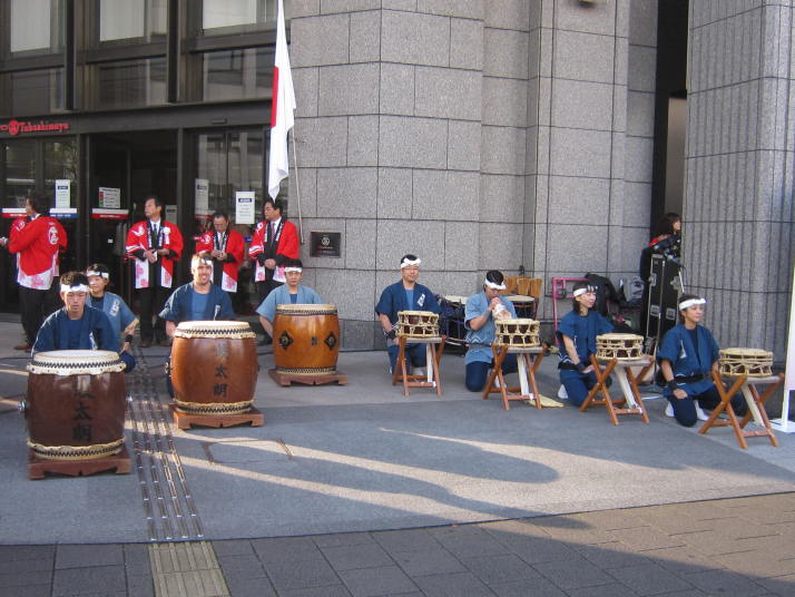 まずは開店前のオープンセレモニーで4曲(出陣・勝鬨・鼓魂・二挺太鼓)を演奏しました。